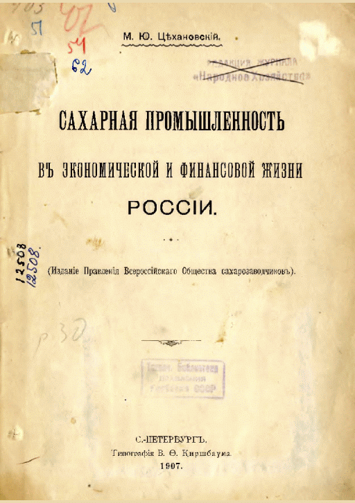 Цехановский, М.Ю. Сахарная промышленность в экономической и финансовой жизни России / М. Ю. Цехановский. — Санкт-Петербург : Правление Всероссийского общества сахарозаводчиков, 1907. — 72, 84 с.: табл.. — . Напечатано по старой орфографии.