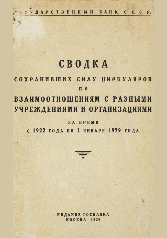 Сводка сохранивших силу циркуляров по взаимоотношениям с разными учреждениями и организациями за время с 1922 года по 1 января 1929 года / Государственный банк СССР. — Москва : Издание Госбанка, 1929. — 165 с.
