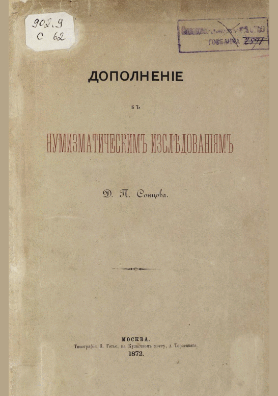 Сонцов, Д.П. Дополнение к нумизматическим исследованиям / Д. П. Сонцов. — Москва, 1872. — 69 с.. — . Напечатано по старой орфографии.