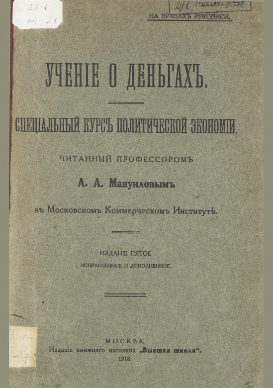 Мануилов, А.А. Учение о деньгах : Специальный курс политической экономии, читанный в Московском Коммерческом Институте / А. А. Мануилов. — 5-е изд., На правах рукописи. — Москва : Высшая школа, 1918. — 160 с.. — . Напечатано по старой орфографии.