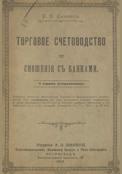 Сиверс, Е.Е. Торговое счетоводство и сношения с банками / Е. Е. Сиверс. — 4-е изд., стереотип.. — Петроград : Издание А.Э. Винеке, 1917. — 389, IX с.. — . Напечатано по старой орфографии. — (в пер.) : 500.00 р.