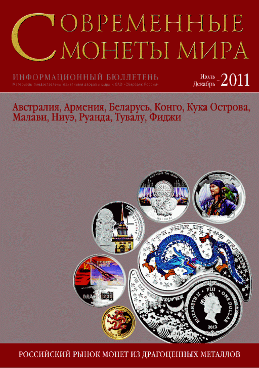 В девятом выпуске бюллетеня представлены монеты десяти иностранных государств, поступившие на российский рынок во втором полугодии 2011 г., всего - 73 монеты. Традиционно к новому году лунного календаря большинство изготовителей предлагает широкий выбор монет самого разнообразного дизайна, посвященных одному из двенадцати "лунных" животных, в 2012 г. - Дракону. Новыми выпусками серебряных и золотых монет пополнилась Лунная серия Австралийского монетного двора (Перт), уже хорошо известная коллекционерам. В подарок детям Польский монетный двор, "H. B. Kunstprägeanstalt" (Германия) и Пертский монетный двор отчеканили монеты с изображениями драконов, стилизованных под героев любимых сказок (монеты государства Ниуэ и Тувалу). Оригинальностью дизайна отличаются серии Монетного двора Финляндии: в серии "Лунный календарь (Инь-Ян)" монеты состоят из двух частей каплевидной формы, каждая из которых имеет собственный аверс и реверс. Помещенные в общую капсулу, обе части каждой монеты образуют полный круг, напоминающий знак Инь-Ян. Монеты второй "лунной" серии имеют круглое отверстие в центре, в которое встроено стилизованное изображение одного из животных лунного календаря. Изображение выполнено в технике филиграни и представляет собой плотно закрученную по спирали серебряную витую проволоку.