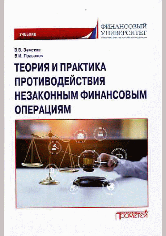 Земсков, В.В. Теория и практика противодействия незаконным финансовым операциям : учебник / В. В. Земсков, В. И. Прасолов; редактор В. В. Земсков; Финансовый университет при Правительстве Российской Федерации. — Москва : Прометей, 2023. — 212 с.: ил.. — Библиогр. в конце разд.. — ISBN 978-5-00172-462-9.