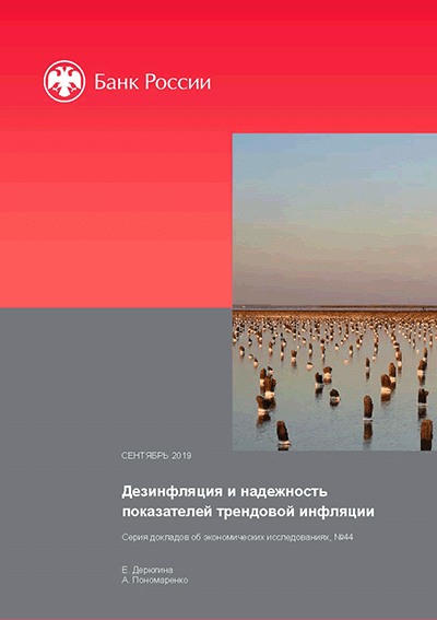 Дерюгина, Е.Б. Дезинфляция и надежность показателей трендовой инфляции / Е. Б. Дерюгина, А. А. Пономаренко; Центральный банк Российской Федерации, Департамент исследований и прогнозирования. — Москва : Банк России, сентябрь 2019. — 28 с.: граф.. — (Серия докладов об экономических исследованиях; № 44). — Библиогр.: с. 21-22.