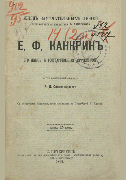 Сементковский, Р.И. Е. Ф. Канкрин : его жизнь и государственная деятельность: биографический очерк / Р. И. Сементковский. — Санкт-Петербург : Общественная польза, 1893. — 94 с.: портр.. — (Жизнь замечательных людей). — . Напечатано по старой орфографии.