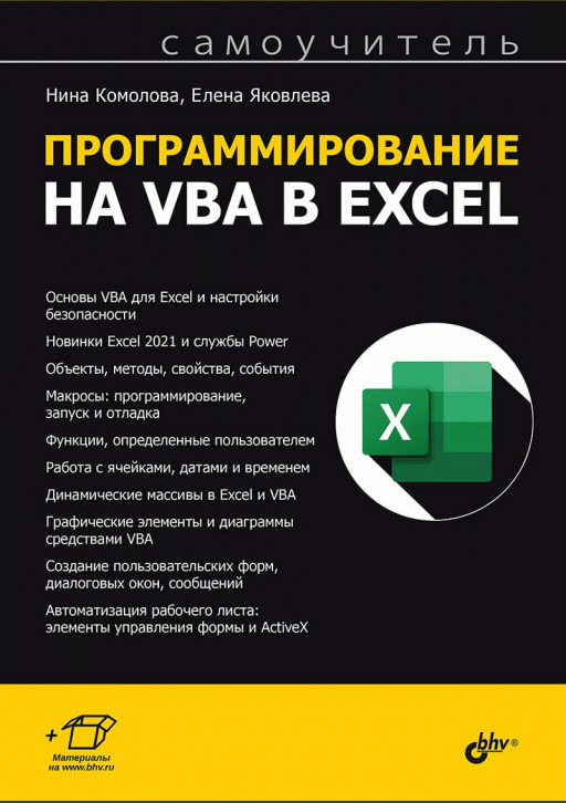 Комолова, Н. Программирование на VBA в Excel : самоучитель / Н. Комолова, Е. Яковлева. — Санкт-Петербург : БХВ-Петербург, 2024. — 512 с.: ил.. — (Самоучитель). — Предм. указ.: с. 503. — ISBN 978-5-9775-1892-5.