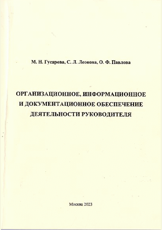 Гусарова, М.Н. Организационное, информационное и документационное обеспечение деятельности руководителя : учебное пособие / М. Н. Гусарова, С. Л. Леонова, О. Ф. Павлова; рецензенты: В. К. Самохвалова, Н. К. Рагимова. — Москва : Угреша Т, 2023. — 117 с.: ил., табл.. — Библиогр.: с. 107.