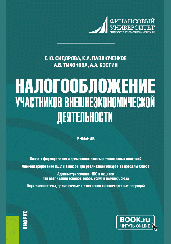 Сидорова, Е.Ю. Налогообложение участников внешнеэкономической деятельности : учебник / Е. Ю. Сидорова, К. А. Павлюченков, А. В. Тихонова, А. А. Костин; рецензенты: Ю. Ю. Костюхин, Ю. В. Малкова; Финансовый университет при Правительстве Российской Федерации. — Москва : КноРус, 2023. — 352 с.: цв. ил., табл., граф.. — (Бакалавриат). — Библиогр.: с. 321-328. — ISBN 978-5-406-10580-1.