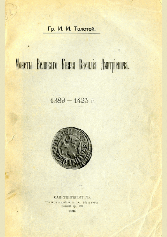 Толстой, И.И. Монеты Великого Князя Василия Дмитриевича. 1389 - 1425 г. / И. И. Толстой. — Прижизн. изд.. — Санкт-Петербург : Типография Б.М. Вольфа, 1911. — 84 с.: ил.+ 5л. (табл.). — . Напечатано по старой орфографии.