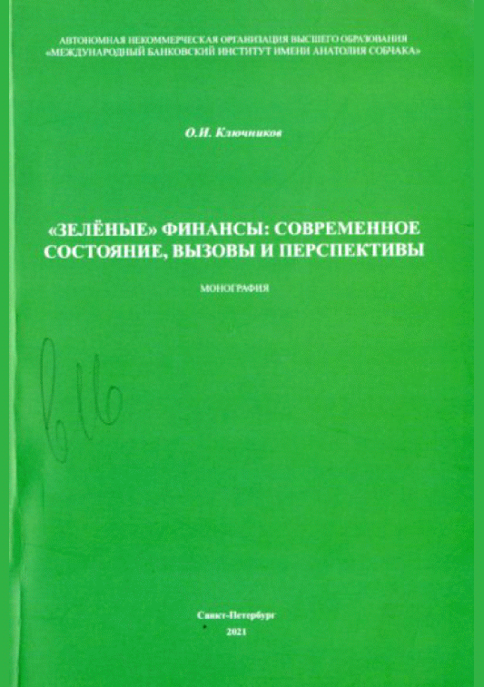 Ключников, О.И. "Зеленые" финансы : современное состояние, вызовы и перспективы : монография / О. И. Ключников; Международный банковский институт имени Анатолия Собчака. — Санкт-Петербург : МБИ имени Анатолия Собчака, 2021. — 496 с.: ил., табл.. — Библиогр.: с. 467-496. — ISBN 978-5-4228-0136-7.