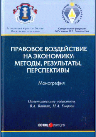 Правовое воздействие на экономику: методы, результаты, перспективы, Legal Impact on the Economy: Methods, Results, Perspectives : монография / Московский государственный университет им. М.В. Ломоносова, Юридический факультет, Ассоциация юристов России, Московское отделение (Комиссия по правовому регулированию экономической деятельности и Комиссия по совершенствованию антимонопольного законодательства); отв. ред.: В. А. Вайпан, М. А. Егорова. — Москва : Юстицинформ, 2018. — 379 с.. — Библиогр. в конце глав. — ISBN 978-5-7205-1428-0 : 833.00 р.