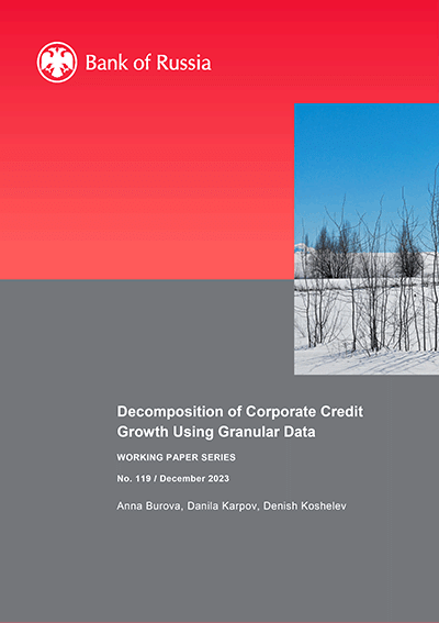 Burova, A. Decomposition of corporate credit growth using granular data / A. Burova, D. Karpov, D. Koshelev; The Central Bank of the Russian Federation, Research and Forecasting Department. — Moscow : Bank of Russia, december 2023. — 35 p.: il., табл.. — (Working paper series; # 119). — References: p. 32.