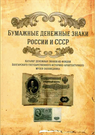 Бумажные денежные знаки России и СССР : каталог денежных знаков из фондов Болгарского государственного историко-архивного музея-заповедника / Министерство культуры Республики Татарстан, Болгарский государственный историко-архитектурный музей-заповедник; сост., авт. вступ. ст. Д. Г. Мухаметшин; ред. Д. Д. Натфуллин. — Ульяновск : Печатный двор, 2018. — 184 с.: ил.. — ISBN 978-5-7572-0441-3 : 100.00 р.