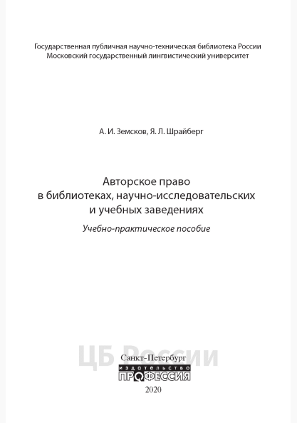 Земсков, А.И. Авторское право в библиотеках, научно-исследовательских и учебных заведениях : учебно-практическое пособие. — Санкт-Петербург : Профессия, 2019. — 276 с.: граф., цв. ил., табл.. — Библиогр.: с. 273-275. — ISBN 978-5-9909838-2-3.