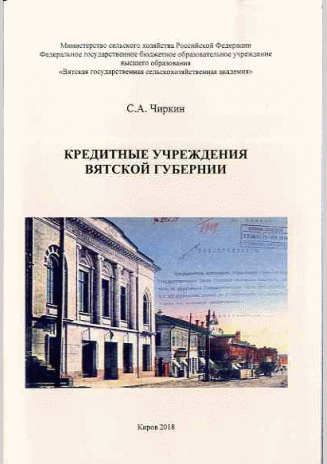 Чиркин, С.А. Кредитные учреждения Вятской губернии : монография / С. А. Чиркин; Министерство сельского хозяйства Российской Федерации, Вятская государственная сельскохозяйственная академия. — Киров : Вятская ГСХА, 2018. — 160 с.: ил., табл.. — Библиогр.: с. 136-139. — ISBN 978-5-6040852-7-1.