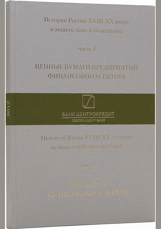 Ценные бумаги предприятий финансового сектора / составители: А. Тарасов [и др.]. — Подарочное издание. — Москва, 2012. — 167 с.: цв. ил., фот.. — (История России XVIII-XX веков в акциях, паях и облигациях; Ч. 1). — Алф. указ.: с. 162-165.