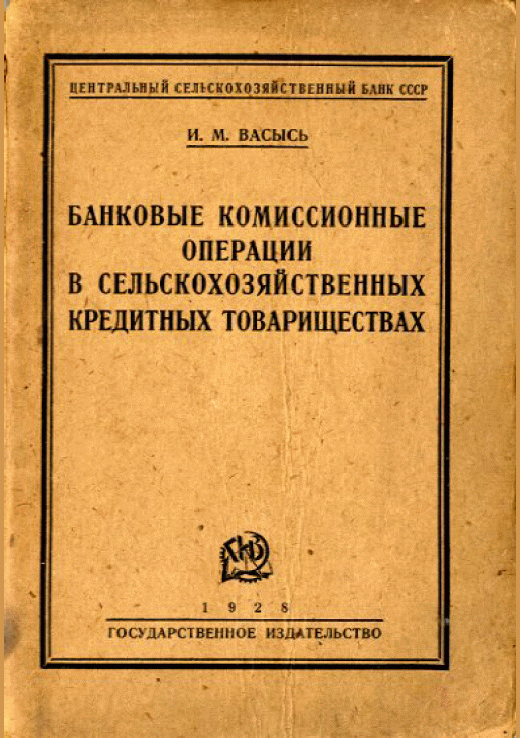 Васысь, И.М. Банковые комиссионные операции в сельскохозяйственных кредитных товариществах / И. М. Васысь; автор предисловия Я. Галяшкин; Центральный сельскохозяйственный банк СССР. — МоскваЛенинград : Государственное издательство, 1928. — 160 с.: обр., табл.