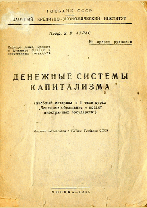 Атлас, З.В. Денежные системы капитализма : учебное пособие к I теме курса "Денежное обращение и кредит иностранных государств" / З. В. Атлас; Государственный банк СССР, Заочный кредитно-экономический институт, Кафедра денег, кредита и финансов СССР и иностранных государств. — На правах рукописи. — М., 1945. — 15 с.. — 1500.