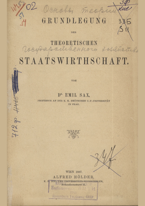 Sax, E. Grundlegung der theoretischen Staatswirtschaft / E. Sax. — Wien : Alfred Hölder, 1887. — XXIV, 574 S.