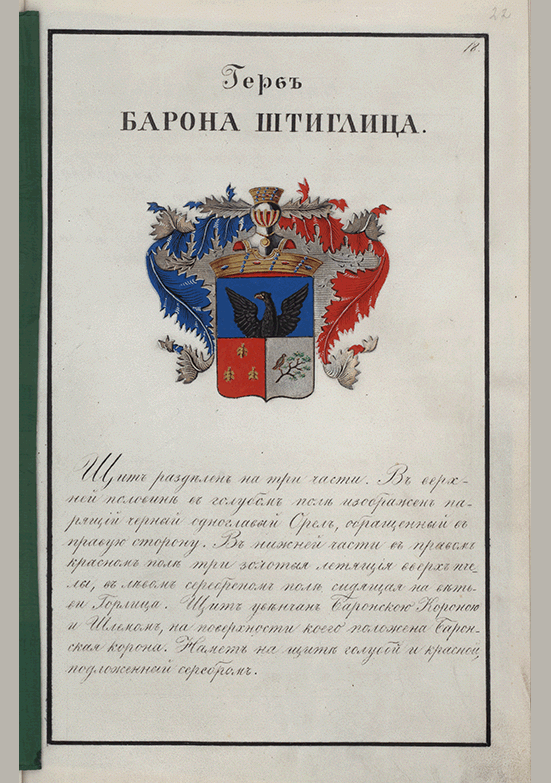 Герб барона Штиглица, высочайше утвержденный 17 марта 1831 г.. — 2 с.. — . РГИА, рукописные материалы, Ф. 1411.Oп. 1. Д. 100. № 18. Л. 22, 22 об.