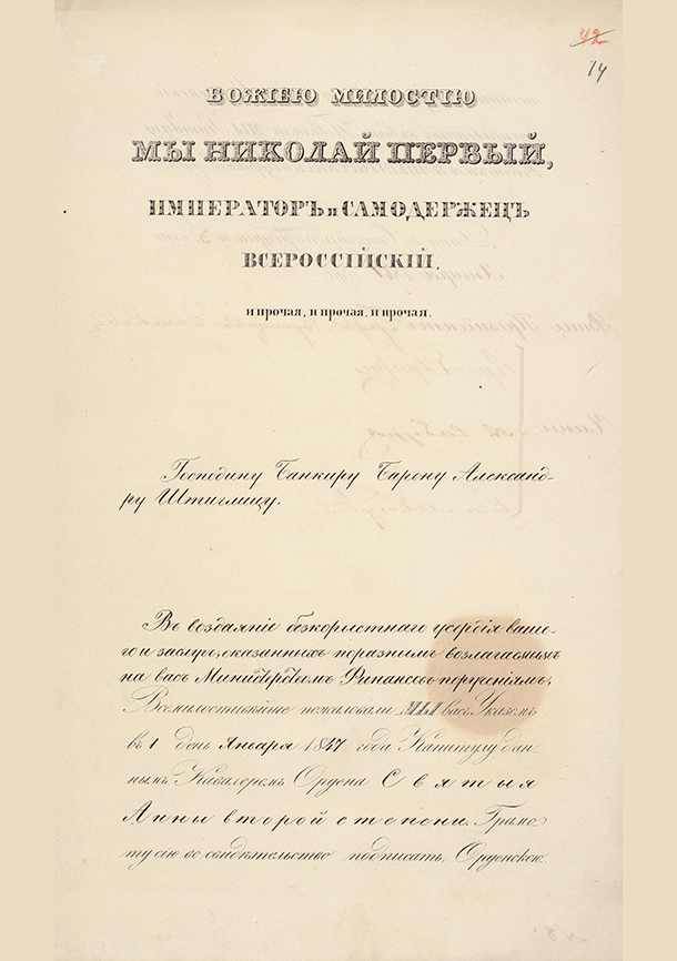 Николай Первый Грамота о награждении орденом Св. Анны 2-й степени банкира А.Л. Штиглица. 3 января 1847 г. / Николай Первый. — 2 с.. — . РГИА, рукописные материалы, Ф. 1091.Oп. 1. Д. 2. Л. 14, 14 об.