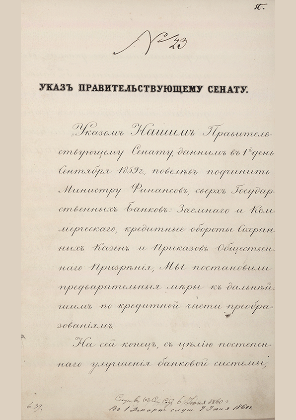 Именной указ об учреждении Государственного банка от 31 мая 1860 г.