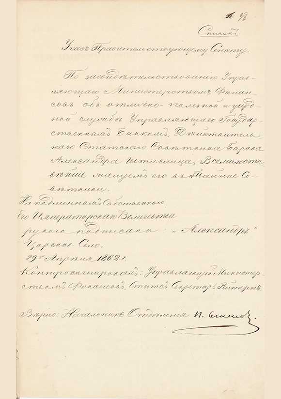 Александр Второй Именной указ Правительствующему Сенату о награждении барона А.Л. Штиглица чином тайного советника за отлично полезную и усердную службу. 29 апреля 1862 г. / Александр Второй. — 1 с.. — . РГИА, рукописные материалы, Ф. 587. Оп. 24. Д. 559. Л. 38.