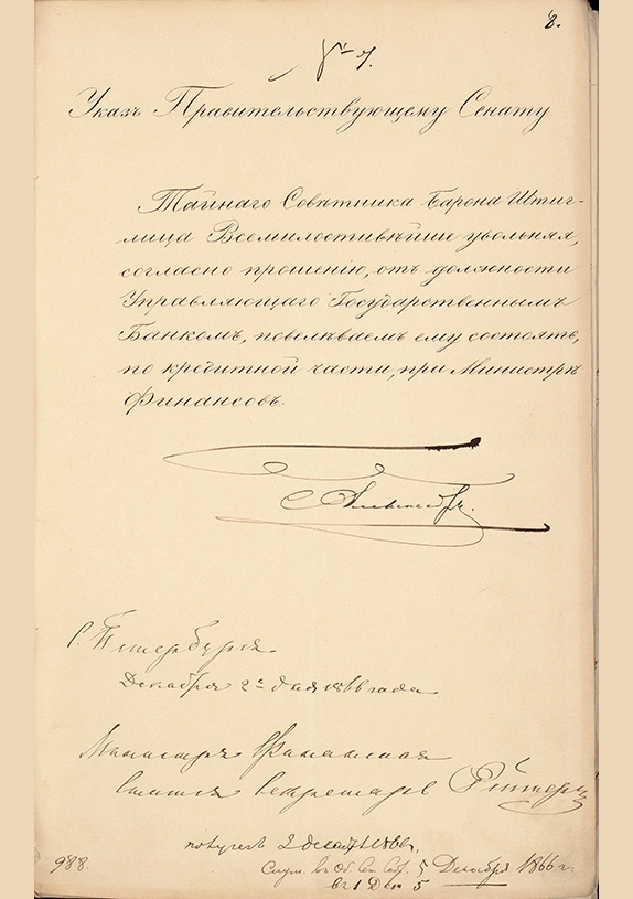Александр Второй Именной указ Правительствующему Сенату об увольнении согласно прошению от должности управляющего Государственным банком барона А.Л. Штиглица и о назначении ему "состоять по кредитной части при министре финансов". 2 декабря 1866 г. / Александр Второй. — 1 с.. — . РГИА, рукописные материалы, Ф. 1329. Oп. 1. Д. 791. Л. 8.