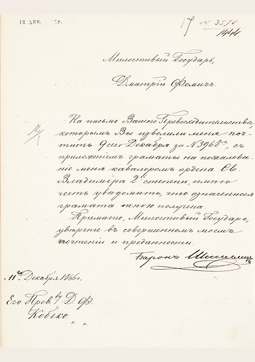 Письмо управляющему Общей канцелярией Министерства финансов Д.Ф. Кобеко о получении им грамоты на пожалование ордена Св. Владимира 2-й степени. 11 декабря 1866 г.