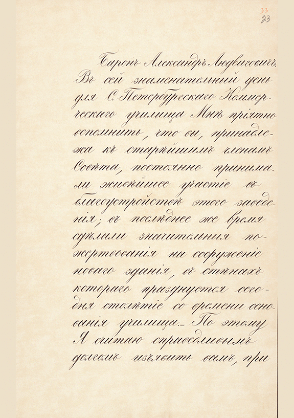 Александр Второй Рескрипт с выражением благодарности барону А.Л. Штиглицу за его труды по благоустройству Санкт-Петербургского коммерческого училища. 6 декабря 1872 г. / Александр Второй. — 4 с.. — . РГИА, рукописные материалы, Ф. 1091. Оп. 1. Д2. Л. 22, 22 об., 23, 23 об.