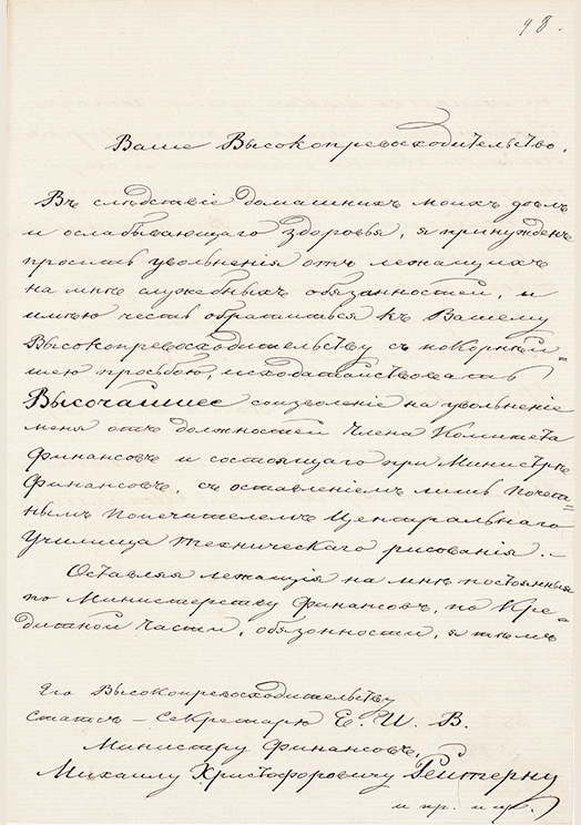 Письмо министру финансов М.Х. Рейтерну с просьбой уволить его от всех занимаемых должностей "вследствие домашних дел и ослабевающего здоровья" и об оставлении его "лишь почетным попечителем Центрального училища технического рисования". 28 мая 1878 г.