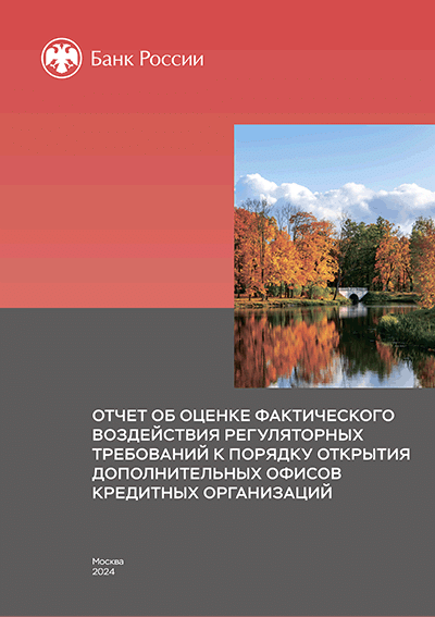Отчет об оценке фактического воздействия регуляторных требований к порядку открытия дополнительных офисов кредитных организаций / Центральный банк Российской Федерации, Департаментом допуска и прекращения деятельности финансовых организаций, Департамента стратегического развития финансового рынка. — Москва : Банк России, 2024. — 74 с.: граф., табл.
