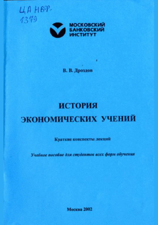Дроздов, В.В. История экономических учений : краткие конспекты лекций: учебное пособие для студентов всех форм обучения / В. В. Дроздов; рецензент: М. Г. Покидченко, О. Д. Кузнецова. — Москва : Московский банковский институт, 2002. — 42 с.