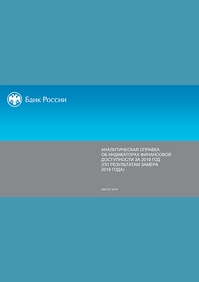 Аналитическая справка об индикаторах финансовой доступности за 2018 год (по результатам замера 2019 года) : [презентация] [Слайды] / Центральный банк Российской Федерации, Служба по защите прав потребителей и обеспечению доступности финансовых услуг. — Москва : Банк России, август 2019. — 12 сл.: граф., табл.