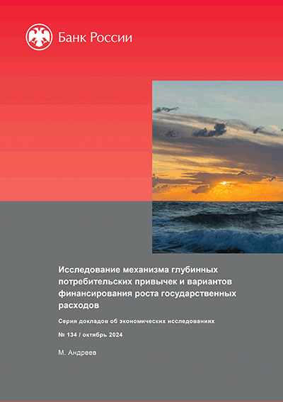 Андреев, М.Ю. Исследование механизма глубинных потребительских привычек и вариантов финансирования роста государственных расходов / М. Андреев; Центральный банк Российской Федерации, Департамент исследований и прогнозирования. — Москва : Банк России, октябрь 2024. — 37 с.: граф., табл.. — (Серия докладов об экономических исследованиях; № 134). — Библиогр.: с. 36-37.
