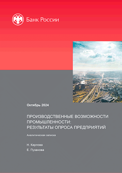 Карлова, Н. Производственные возможности промышленности : результаты опроса предприятий / Н. Карлова, Е. Пузанова; Центральный банк Российской Федерации, Департамент исследований и прогнозирования. — Москва : Банк России, октябрь 2024. — 17 с.: граф., табл.. — (Аналитическая записка).