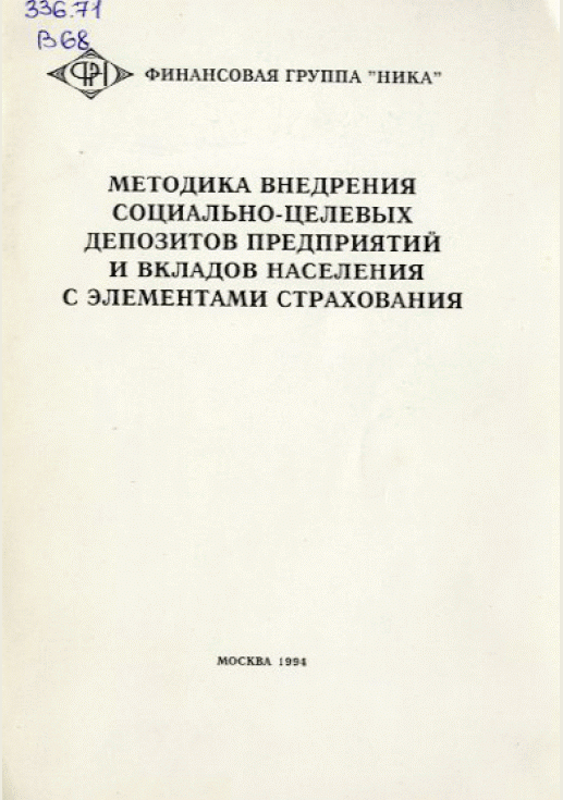 Володина, В.Н. Методика внедрения социально-целевых депозитов предприятий и вкладов населения с элементами страхования / В. Н. Володина. — Москва : Финансовая группа НИКА, 1994. — 37 с.: табл., обр.