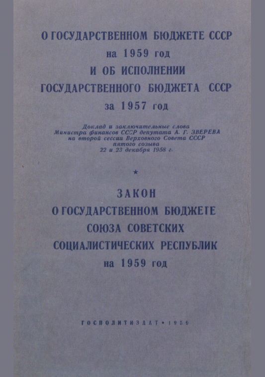 Зверев, А.Г. О государственном бюджете СССР на 1959 год и об исполнении государственного бюджета СССР за 1957 год: доклад и заключительные слова Министра финансов СССР на второй сессии Верховного Совета СССР пятого созыва 22 и 23 декабря 1958 г.. — Москва : Государственное издательство политической литературы, 1959. — 40 с.