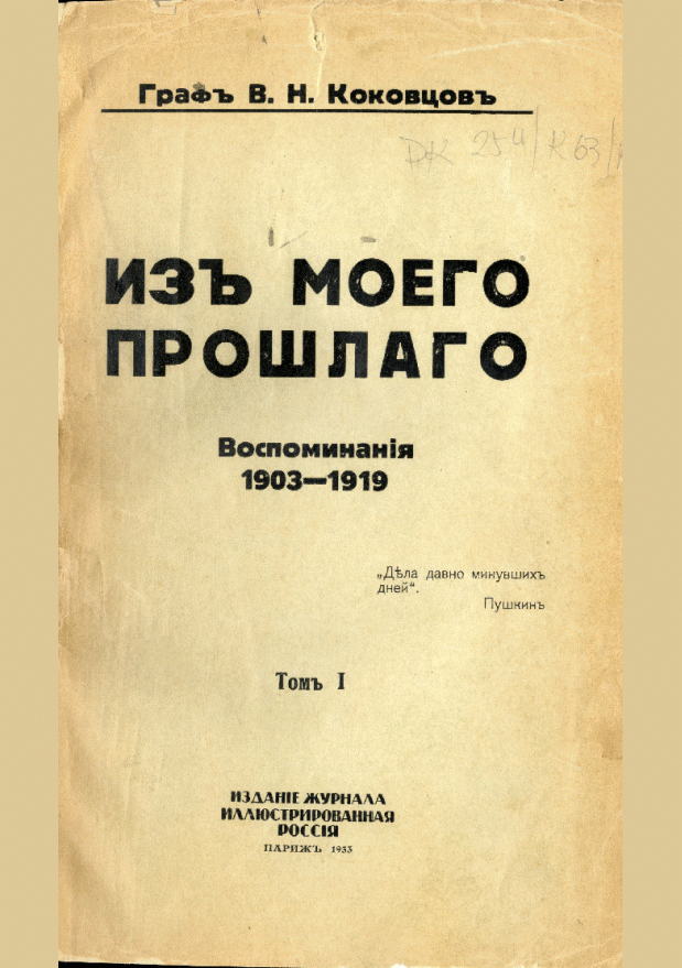 - 1. Коковцов, В.Н. Из моего прошлого / В. Н. Коковцов. — Париж : Издание журнала "Иллюстрированная Россия", 1933. — 509 с.