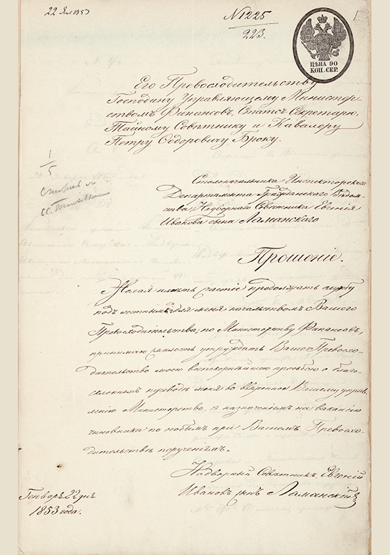 Прошение столоначальника Инспекторского департамента гражданского ведомства надворного советника Е.И. Ламанского министру финансов П.Ф. Броку о переводе его в Министерство финансов чиновником особых поручений.