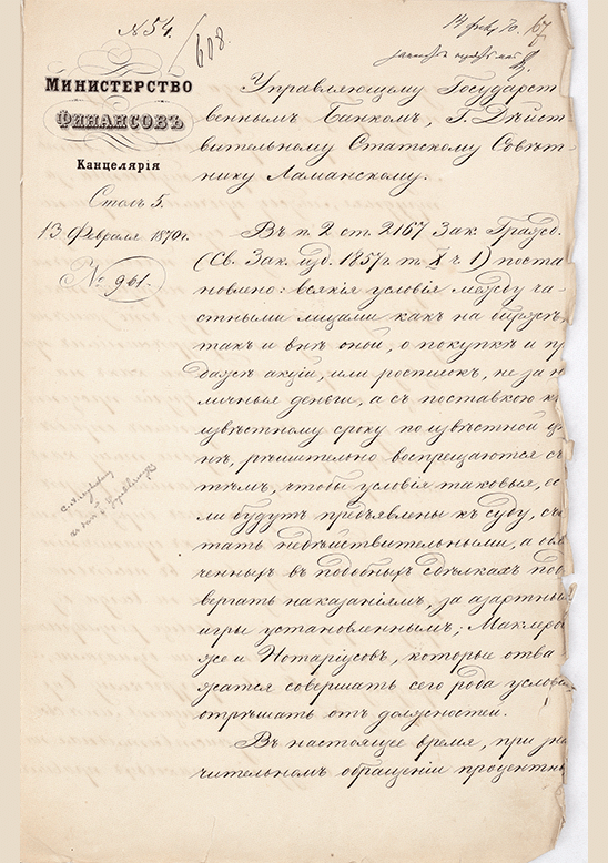 Предложение министра финансов М.Х. Рейтерна управляющему Государственным банком Е.И. Ламанскому о срочных сделках на процентные бумаги в России. 13 февраля 1870 г. Автограф М.Х. Рейтерна.. — Б. м., 1870. — 4 с.. — . РГИА, Ф. 587. Оп. 11. Д. 86. Л. 67, 67 об., 68, 68 об.