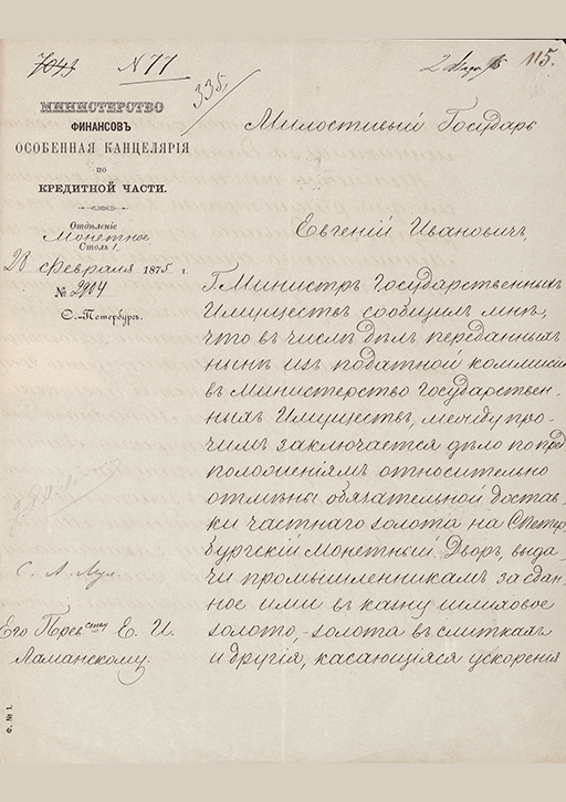 Письмо министра финансов М.Х. Рейтерна управляющему Государственным банком Е.И. Ламанскому по вопросу об отмене обязательной доставки частного золота на Санкт-Петербургский монетный двор. 28 февраля 1875 г. Автограф М.Х. Рейтерна.. — Б. м., 1875. — 3 с.. — . РГИА, Ф. 587. Оп. 11. Д. 86. Л. 115, 115 об., 116.