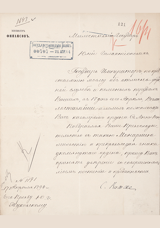 Письмо министра финансов С.Ю. Витте управляющему Государственным банком Ю.Г. Жуковскому о всемилостивейшем пожаловании его орденом Св. Анны 1-й степени. 17 апреля 1894 г. Автограф С.Ю. Витте.. — Б. м., 1894. — 1 с.. — . РГИА, Ф. 587. Оп. 7. Д. 186. Л. 121.