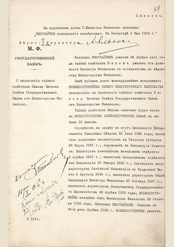 Доклад по Государственному банку о назначении тайного советника И.П. Шипова членом Совета Государственного банка от Министерства финансов. 5 мая 1906 г. Копия. — Б. м., 1906. — 2 с.. — . РГИА, Ф. 587. Оп. 24. Д. 345. Л. 69, 69 об.