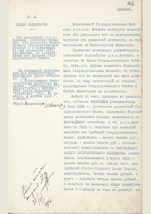 Всеподданнейший доклад министра финансов П.Л. Барка об увольнении А.В. Коншина согласно прошению и о назначении на его должность И.П. Шипова. 2 апреля 1914 г.. — Б. м., 1914. — 2 с.. — . РГИА, Ф. 587. Оп. 24. Д. 345. Л. 126, 126 об.