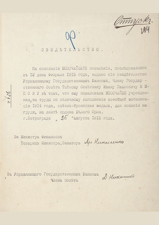 Свидетельство о пожаловании И.П. Шипову за труды по отличному выполнению всеобщей мобилизации 1914 г. светло-бронзовой медали. 25 августа 1915 г.. — Б. м., 1915. — 1 с.. — . РГИА, Ф. 587. Оп. 24. Д. 345. Л. 194.