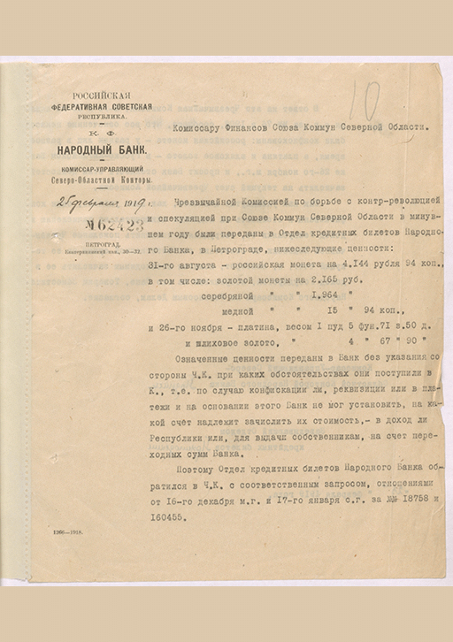 Докладная записка Комиссара-Управляющего Северо-Областной Конторой Народного банка и Заведующего Отделом кредитных билетов от 25 февраля 1919 г. на имя Комиссара Финансов Союза Коммун Северной Области о передаче в доход Республики конфискованных ценностей. — 2 с.. — . РГАЭ, Ф. 2324 . Oп. 3. Д. 106.