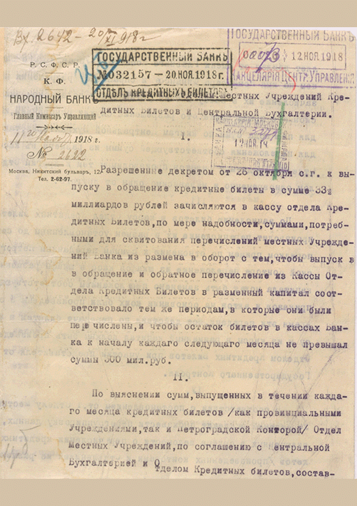 Приказ Главного Комиссара-Управляющего Народным банком от 11 ноября 1918 г. № 2622 "О выпуске в обращение кредитных билетов по декрету Совнаркома РСФСР от 26 октября 1918 г.", г. Москва (оригинальная подпись). — 4 с.. — . РГАЭ, Ф. 2324 . Oп. 3. Д. 378.