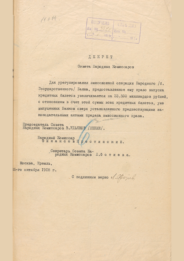 Декрет Совета Народных Комиссаров от 26 октября 1918 г. "О предоставлении Народному банку права выпуска кредитных билетов сверх установленного предшествующими законодательными актами предела эмиссионного права". — 1 с.. — . РГАЭ, Ф. 2324 . Oп. 3. Д. 400.