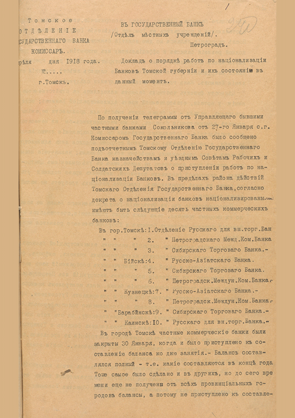 Доклад Комиссара Томского Отделения Государственного банка в Государственный банк (Отдел местных учреждений) (Петроград) от апреля 1918 г. "О порядке работы по национализации Банков Томской губернии и их состоянии в данный момент". — 7 с.. — . РГАЭ, Ф. 2324 . Oп. 25. Д. 48.